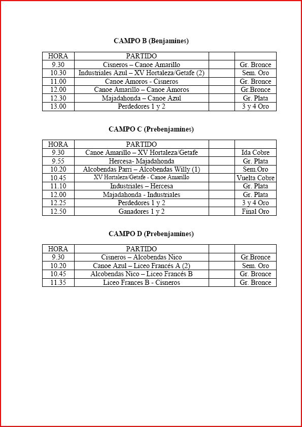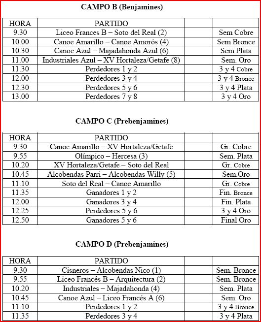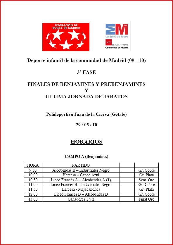 Cambio de horarios para el sábado, según nos acaba de informar la federación, estos son los horarios definitivos para el sábado en Getafe, como cambio significativo, el primer partido de Benjamines, que estaba programado a las 11:00h, se disputará a las 10:30h