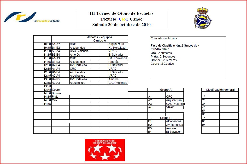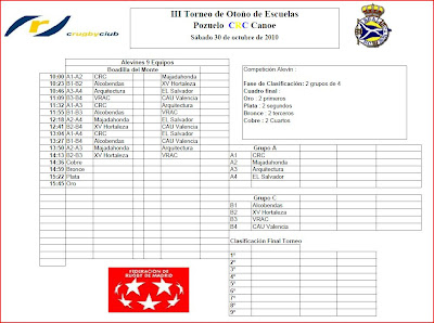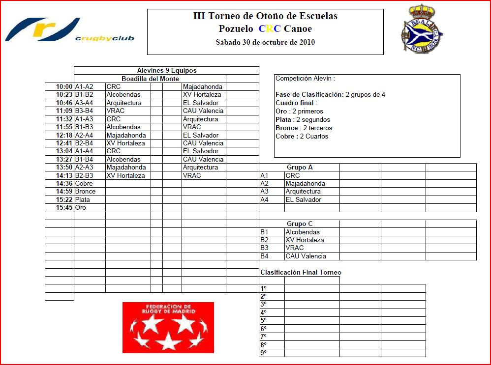 Emparejamientos, para el III Torneo de Escuelas, organizado por el CRC, el proximo día 30 de Octubre, en Boadilla para los Alevines, y en Pozuelo para el resto de categorías, os dejo los enlaces de Google maps a ambos campos debajo de cada categoría: